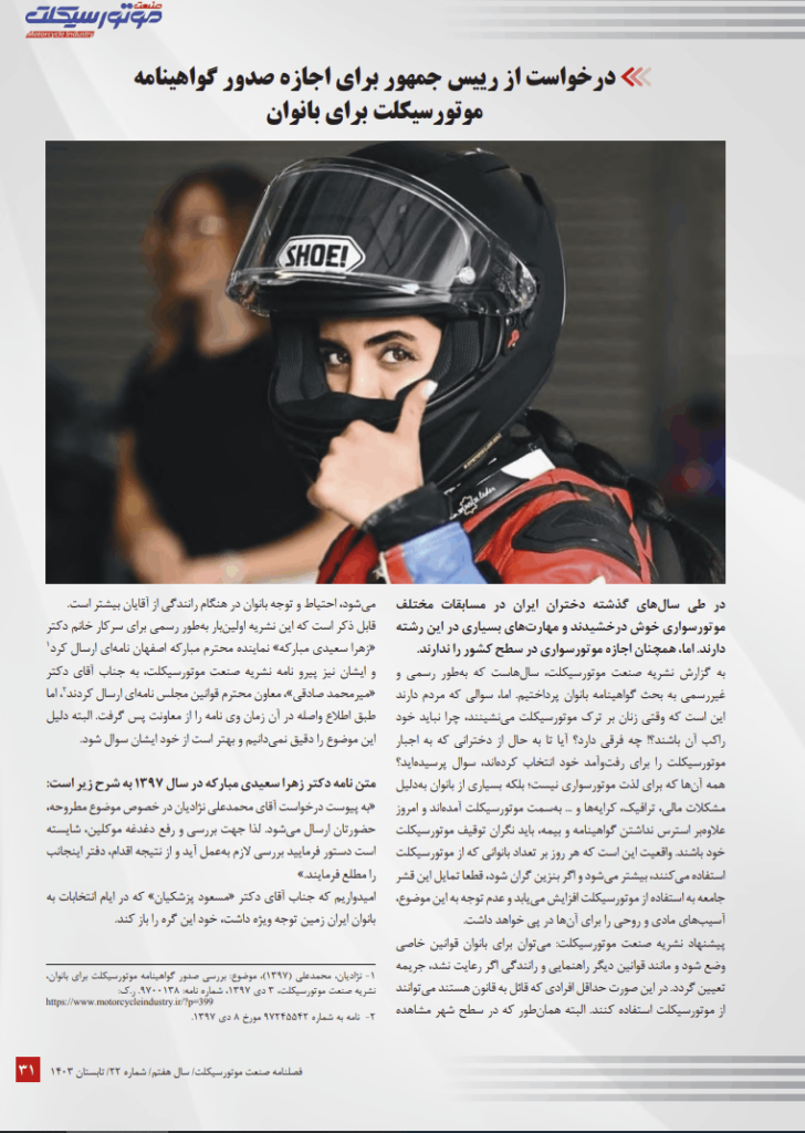البته، سهم اصلی این موفقیت متعلق به خودِ زنان موتورسوار (مانند خانم بهناز شفیعی و دیگر زنان موتورسوار) است که با حضور در خیابانها، پیستها و میادین مسابقات، چهره زنِ موتورسوار ایرانی با توانمندیهای بالا را در جامعه تثبیت کردند و در این لایه، تلاش ما به نوبه خود به پشتیبانی رسانهای آنها متمرکز بود.