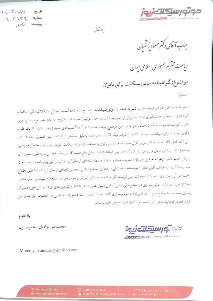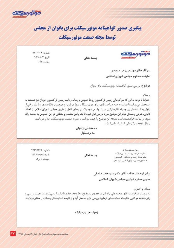 نژادیان: موضوع گواهینامه موتورسیکلت زنان را بهصورت هدفمند و از طریق سه لایه پیگیری حقوقی و اداری، رسانهای و صنعتی (جلب توجه فعالان صنعت موتورسیکلت) طی ۸ سال زنده نگه داشتم.